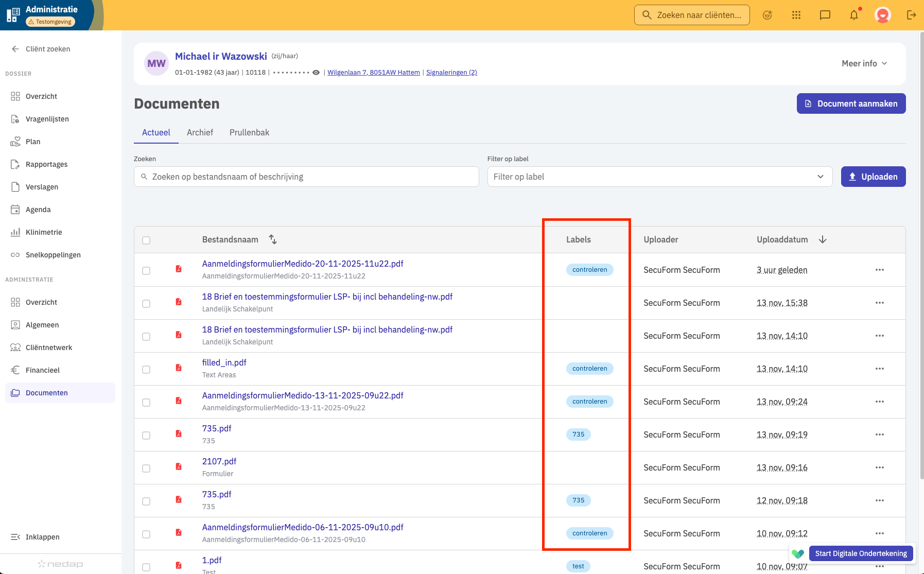 Na het ondertekenen wordt het document, inclusief de digitale handtekeningrapportage, automatisch teruggeplaatst in ONS met de juiste tags. Het oorspronkelijke Word-bestand wordt daarbij gearchiveerd. Hieronder zie je hoe de document + labels eruitzien in Nedap ONS.