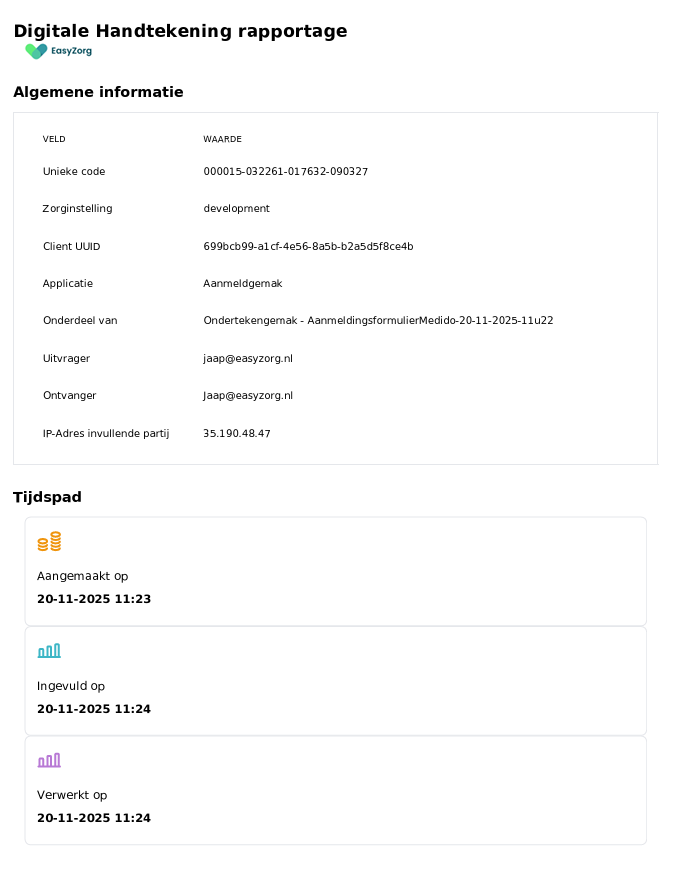 Hieronder zie je hoe de digitale handtekeningrapportage eruitziet die wij toevoegen aan ieder document dat digitaal wordt ondertekend via Ondertekengemak.