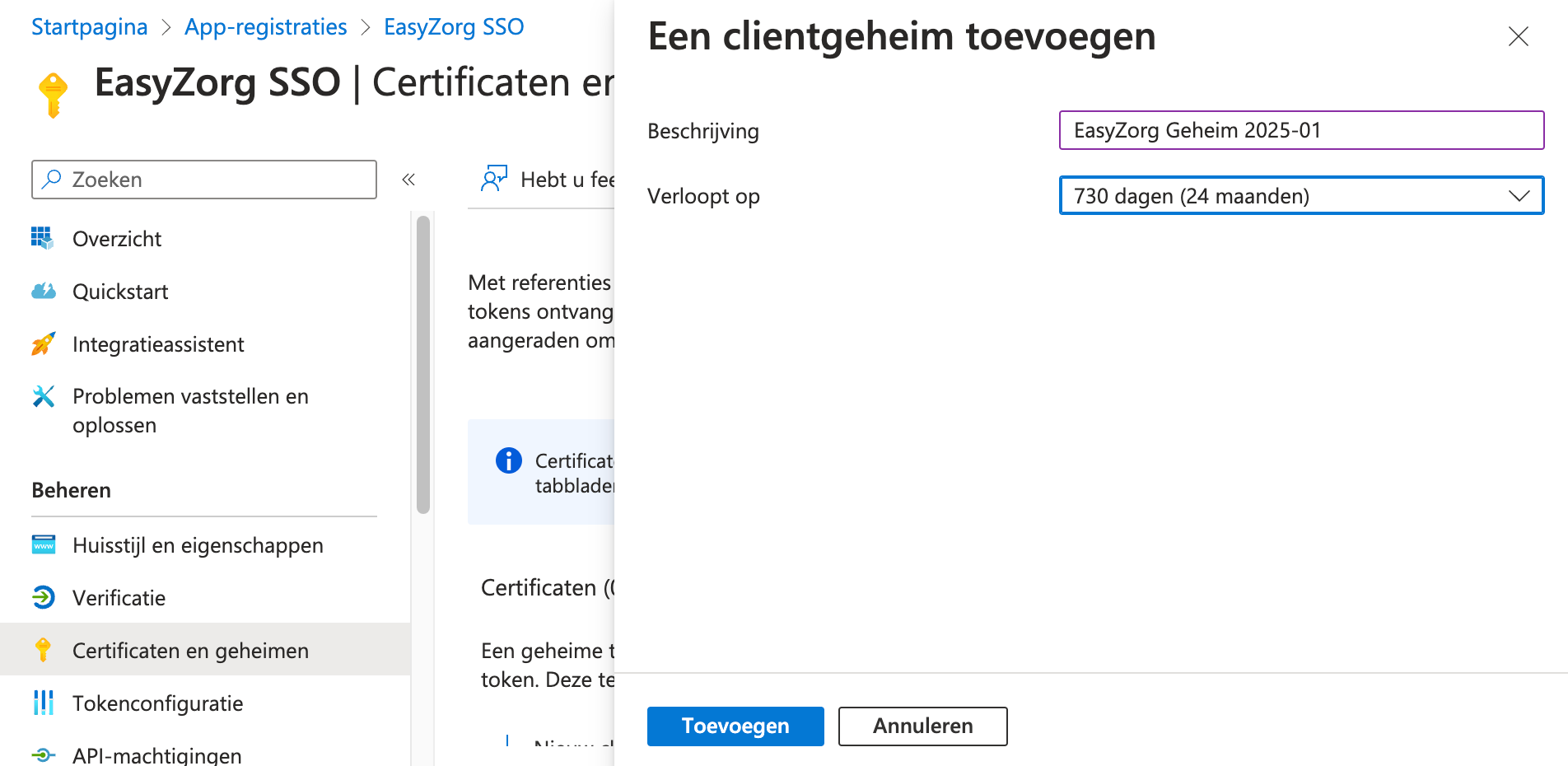 - Klik links op Certificaten & geheimen.
